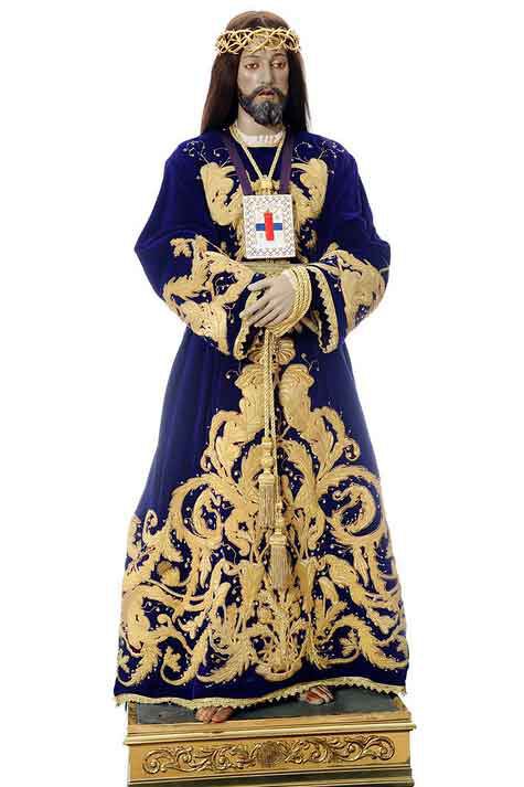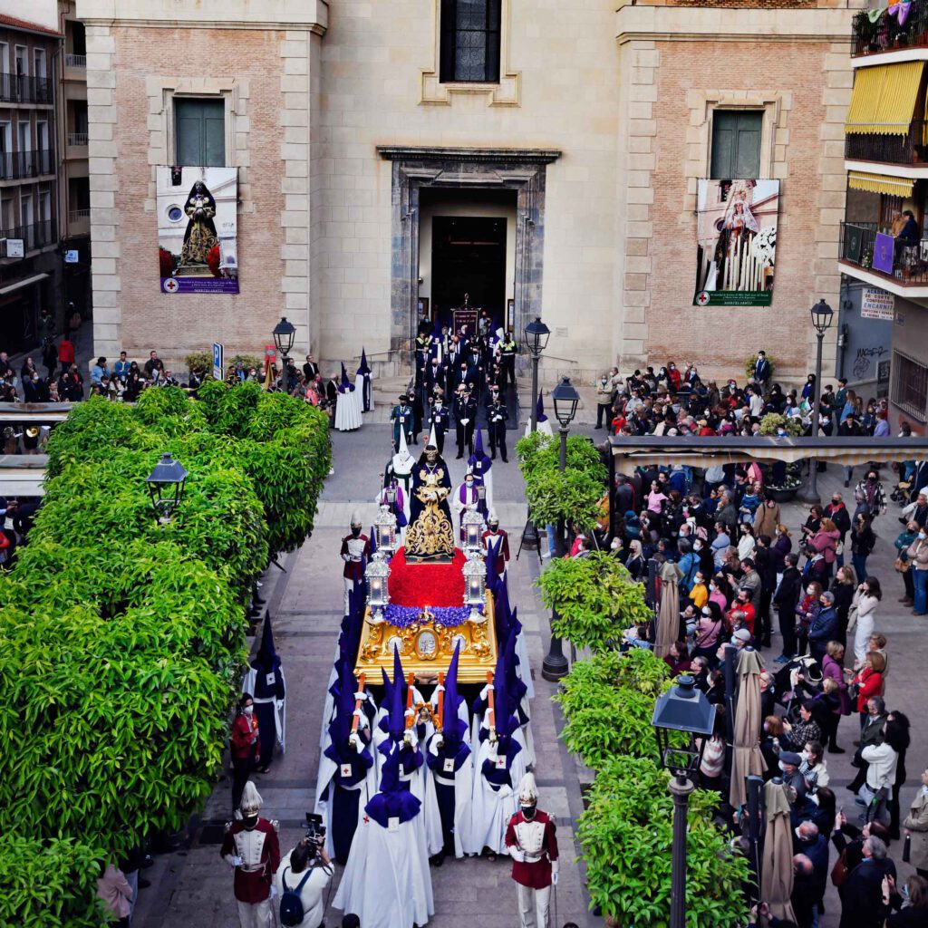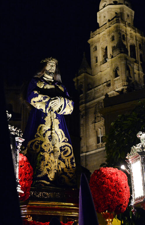 Y resuenan entonces en la plaza, sobre la que se condensa la esencia del universo nazareno, el susurro de cientos de oraciones, de plegarias que nadie dirige a una talla de madera, sino a lo que representa, a aquel siervo ante el que muchos no quieren volver el rostro. Por la esquina de la calle Correos se adivina el espléndido estandarte de María Santísima de la Esperanza, que abre el camino a su hijo, prólogo iluminado de la expresión dulce y serena de Jesús, al que llevan maniatado, al que escupen camino del Calvario, al que insultan aquellos que no respetan a quienes encuentran en él su consuelo, cuando se apaga toda luz en la plaza, entre oraciones, saetas y cánticos que proclaman que el Hijo del hombre no ha venido a ser servido, sino a servir y a dar su vida como rescate por muchos.
