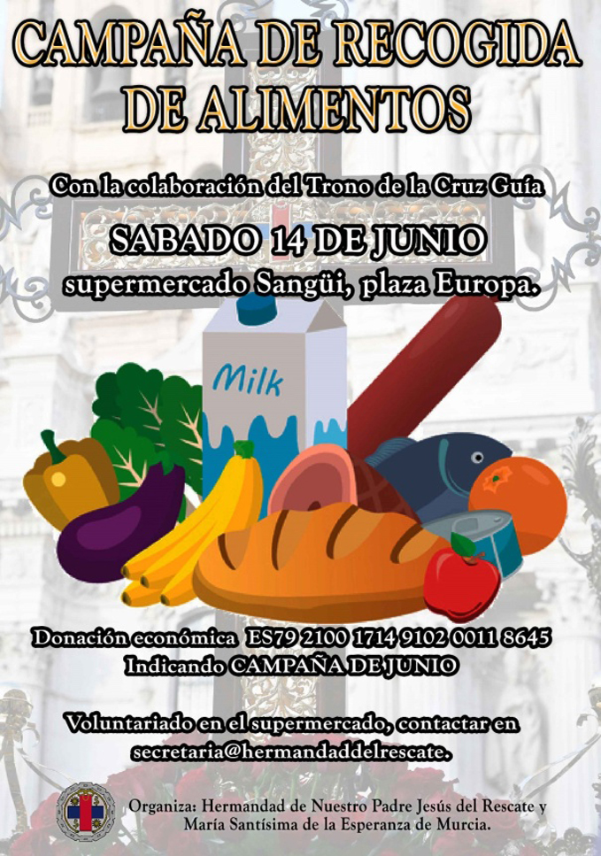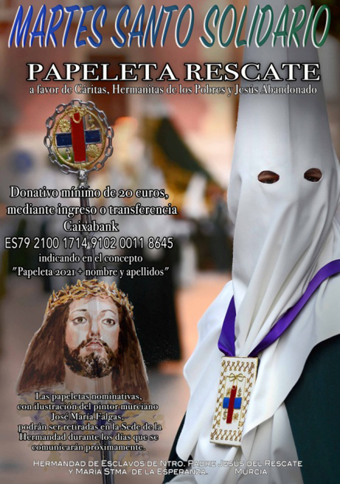 La Hermandad de Esclavos de Nuestro Padre Jesús del Rescate y María Santísima de la Esperanza y, en su nombre, el Hermano Mayor y la Junta de Gobierno, tienen el honor de invitarle a los actos y cultos organizados por esta Hermandad, en la Iglesia Parroquial de San Juan Bautista de Murcia para mayor Gloria y Honor de nuestros Excelsos Titulares.