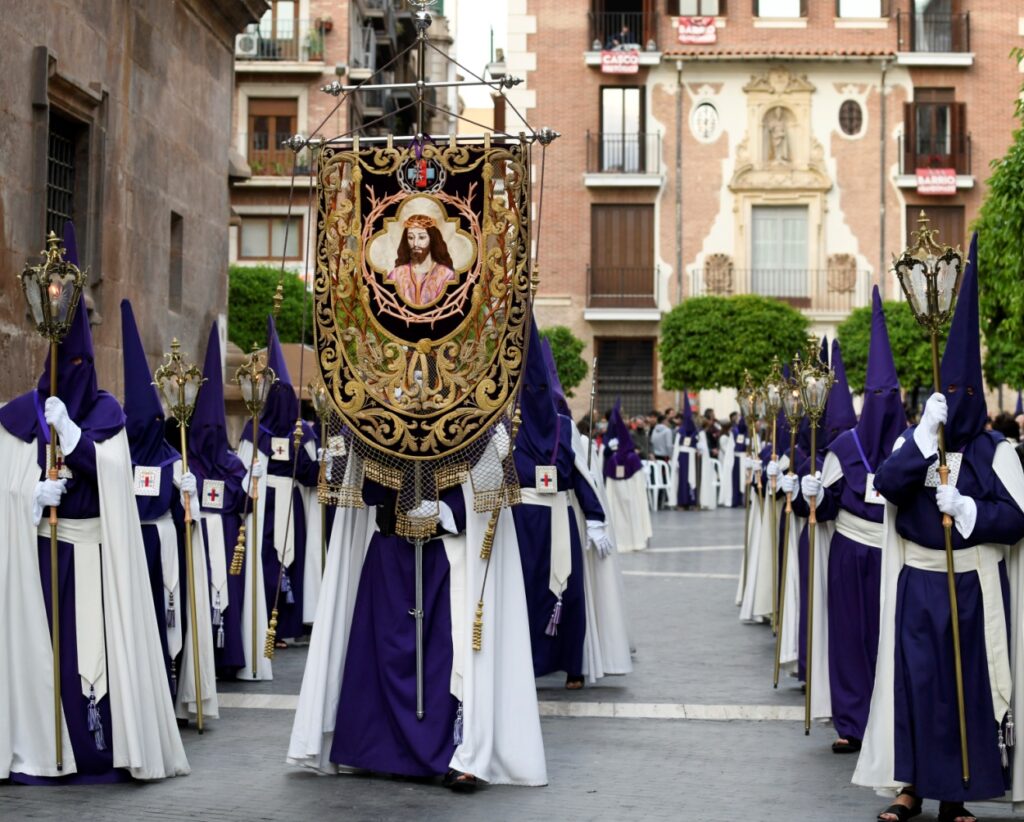 Y resuenan entonces en la plaza, sobre la que se condensa la esencia del universo nazareno, el susurro de cientos de oraciones, de plegarias que nadie dirige a una talla de madera, sino a lo que representa, a aquel siervo ante el que muchos no quieren volver el rostro. Por la esquina de la calle Correos se adivina el espléndido estandarte de María Santísima de la Esperanza, que abre el camino a su hijo, prólogo iluminado de la expresión dulce y serena de Jesús, al que llevan maniatado, al que escupen camino del Calvario, al que insultan aquellos que no respetan a quienes encuentran en él su consuelo, cuando se apaga toda luz en la plaza, entre oraciones, saetas y cánticos que proclaman que el Hijo del hombre no ha venido a ser servido, sino a servir y a dar su vida como rescate por muchos.